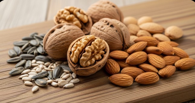 견과류와 씨앗류는 식물성 단백질과 건강한 지방 외에도 멜라토닌 함량이 높은 식품군입니다. 특히 호두, 아몬드, 해바라기씨 등이 대표적입니다.